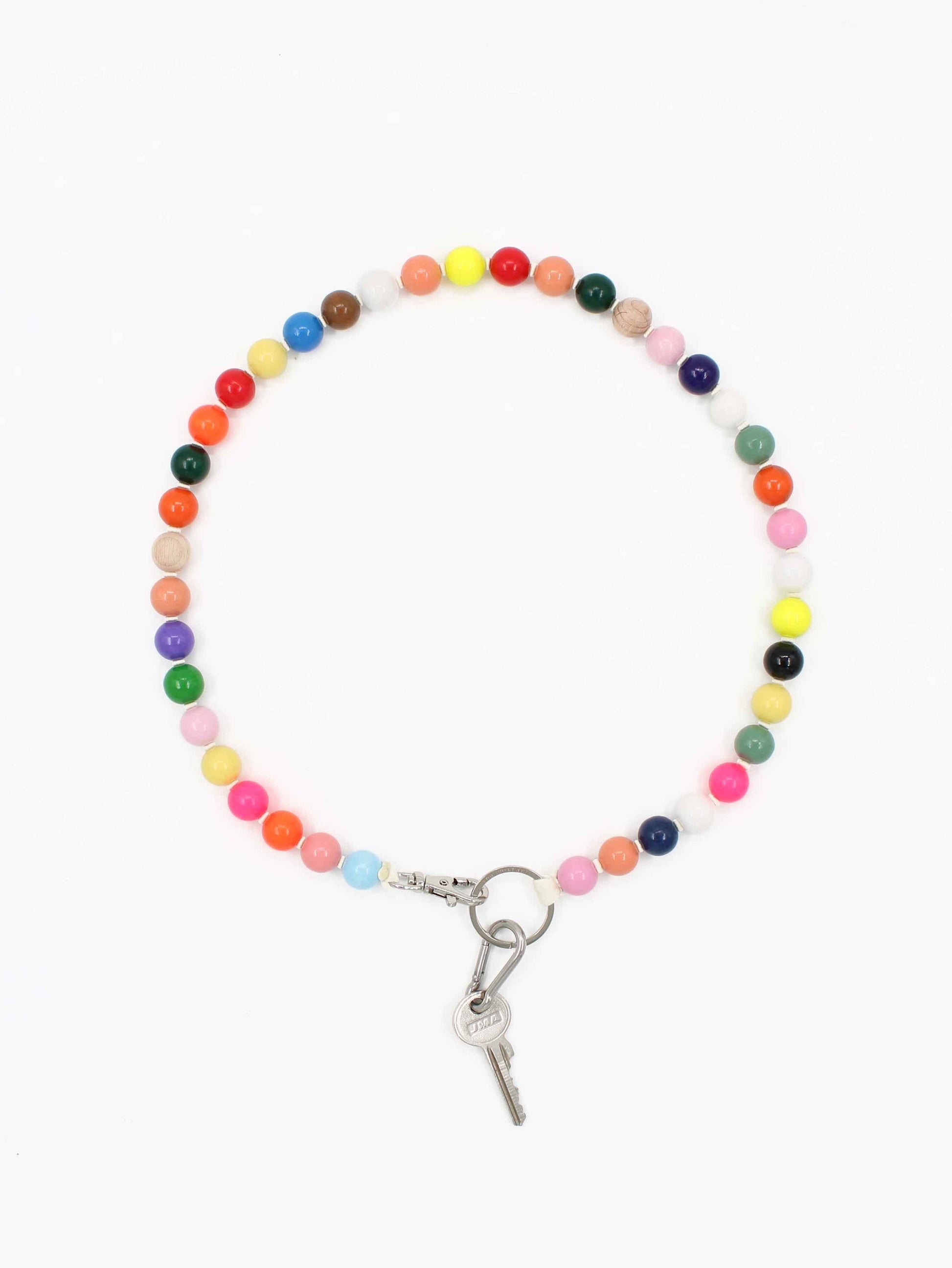 Keychain with elastic band and threaded wooden beads.