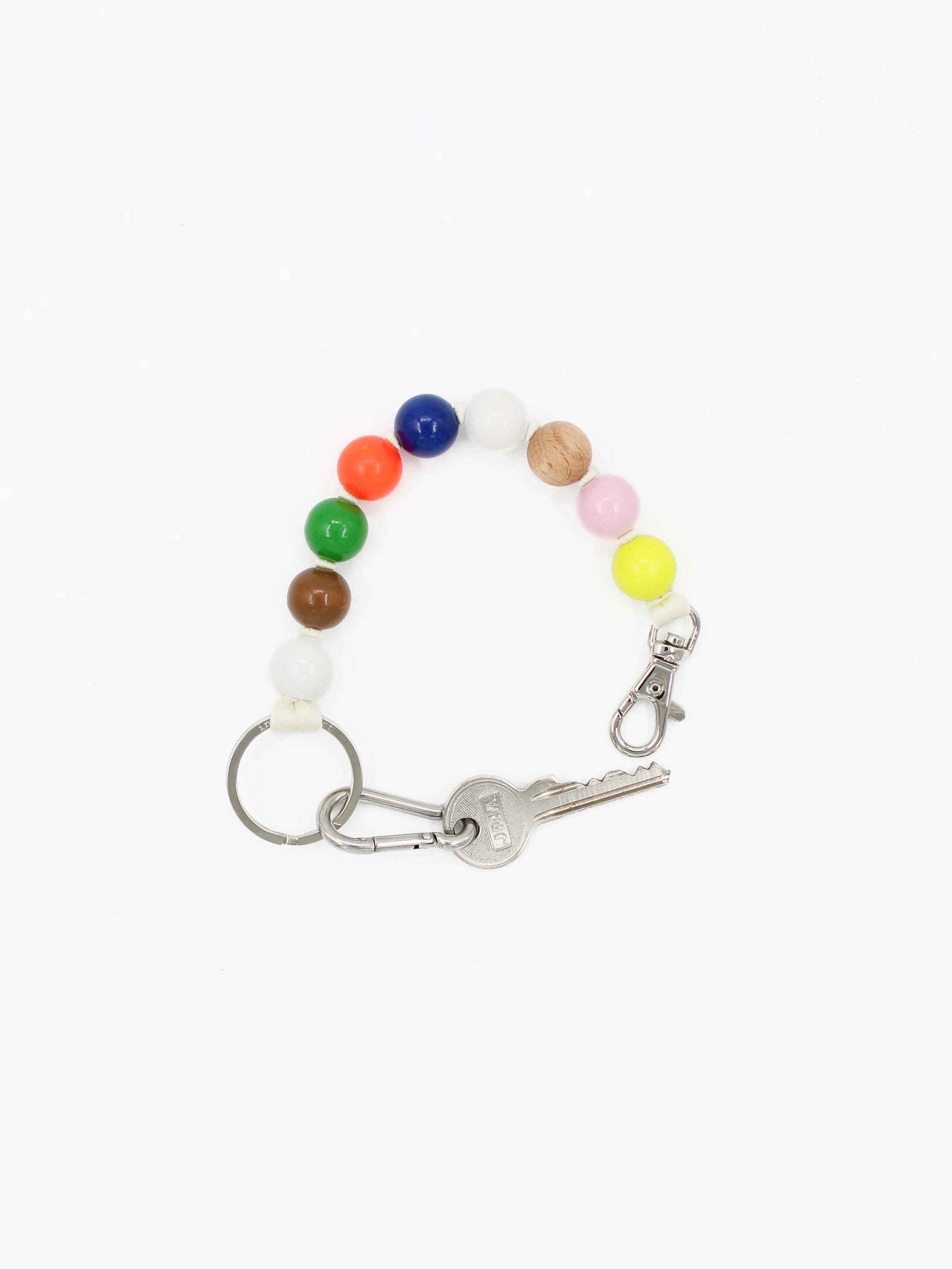 Keychain with elastic band and threaded wooden beads.