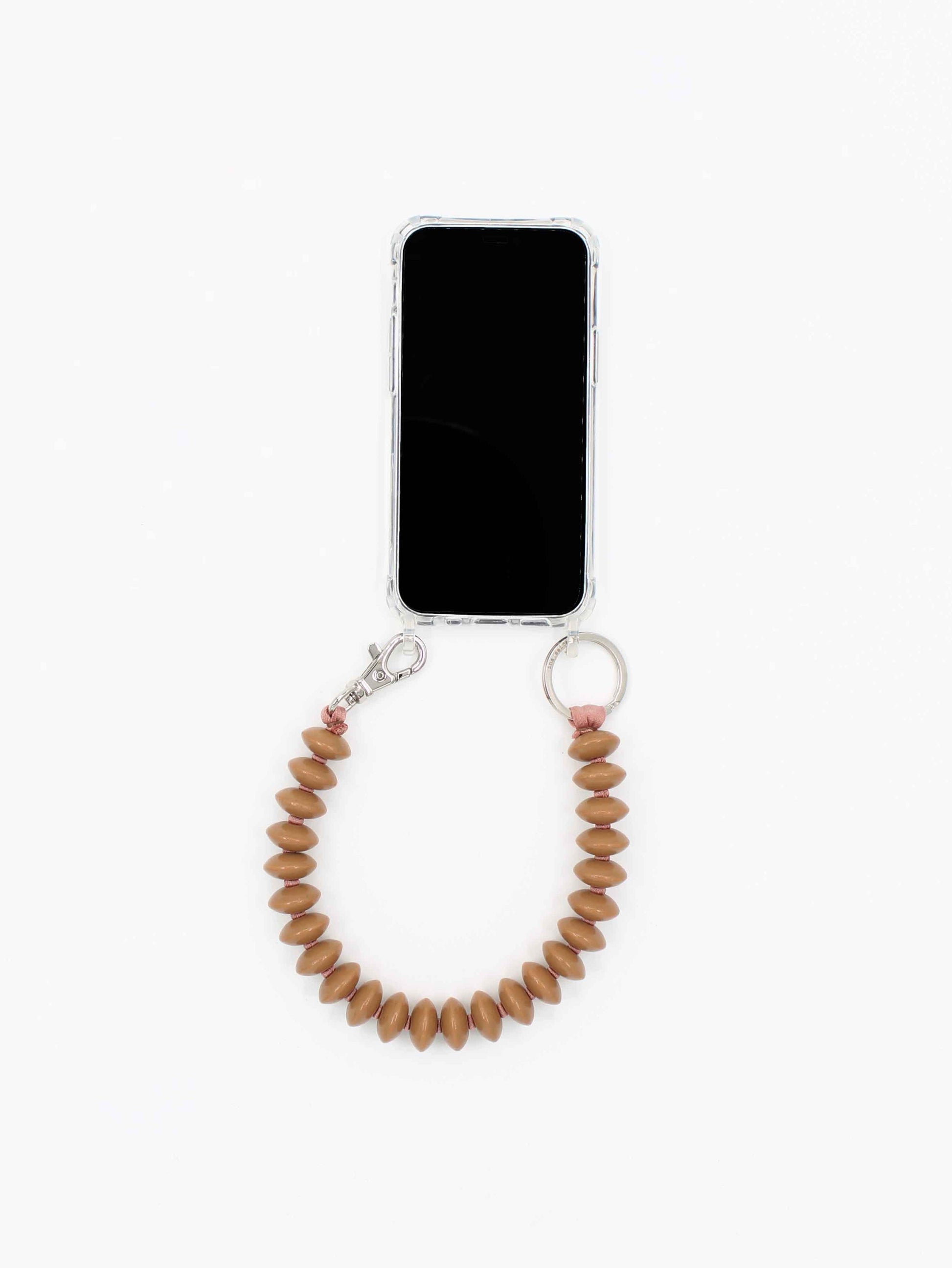 Phone necklace with elastic band and threaded wooden beads.
