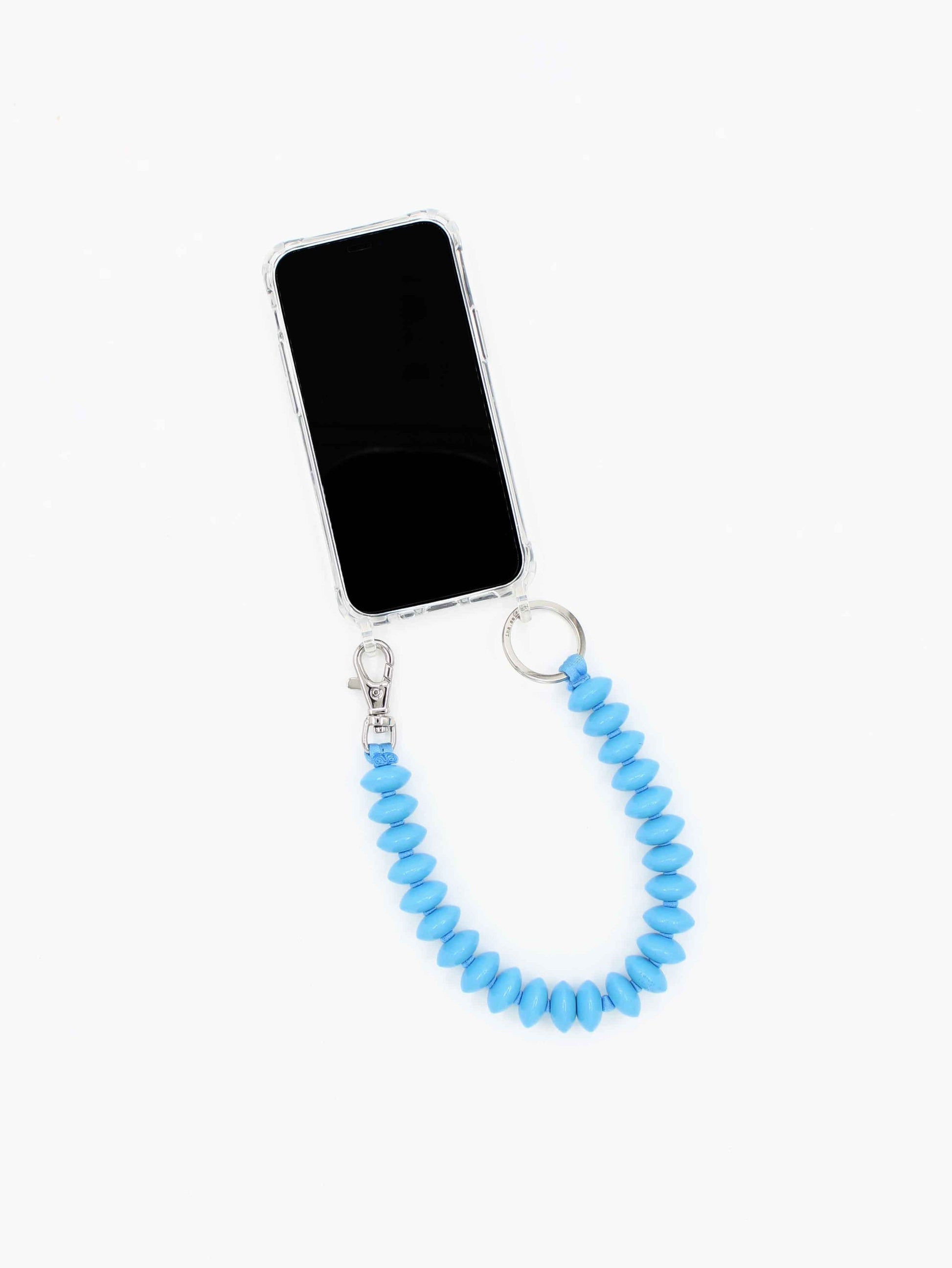 Phone necklace with elastic band and threaded wooden beads.